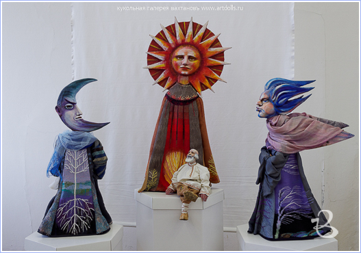 Мария Бохан представила композицию по сказке "Старик и его зятья". Яркие образы героев – Солнца, Ветра и Месяца выполнены в авторской технике. Мария создаёт куклы используя технику плетения гобелена.